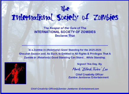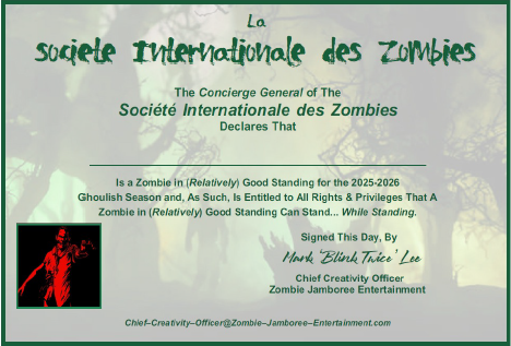 To learn more about those Societies, when these companion sites are created, please visit: www.International-Society- of-Zombies.org and www.Societé-Internationale-des-Zombies.org. In the mean time, you can use the email links below — or, use our primary email address, Chief-Ghoul@Zombie-Jamboree.com — to send us an inquiry. We’ll follow up, open a dialog with you about features & benefits of Membership – and, about the cost, naturally, as well as give you information about Membership Certificates, Z-J coffee mugs, Z-J hats, other Zombie stuff, etc.