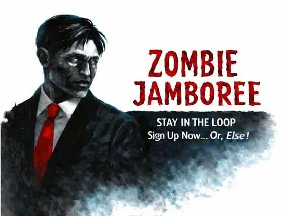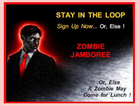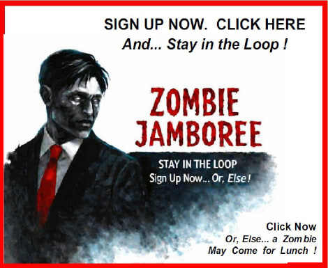 We are still developing the look & feel of our newsletter — “Zombie News & Views” — but we invite you to sign up now, so we can keep you up to date as the plans for the ZOMBIE JAMBOREE come together. The Newsletter will also share other Zombie information, and maybe a story or two. Who knows, you may even have some personal encounters you want to share. By clicking on this link and providing the information requested, you’ll be the first “Friend of the Zombies” in your part of the woods to know what’s shaking & who’s prowling, on their way to the Zombie Jamboree.
